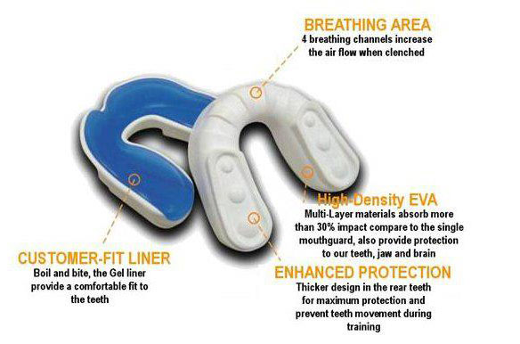 Detta tandskydd har en 2-lagers konstruktion: Det slitstarka yttre skalet ger en relativt hög grad av skydd, samtidigt som insidan är mjuk och därför ger en bekväm passform. Koka i vatten för att justera. Levereras med slitstarkt och praktiskt hårdplastöverdrag.