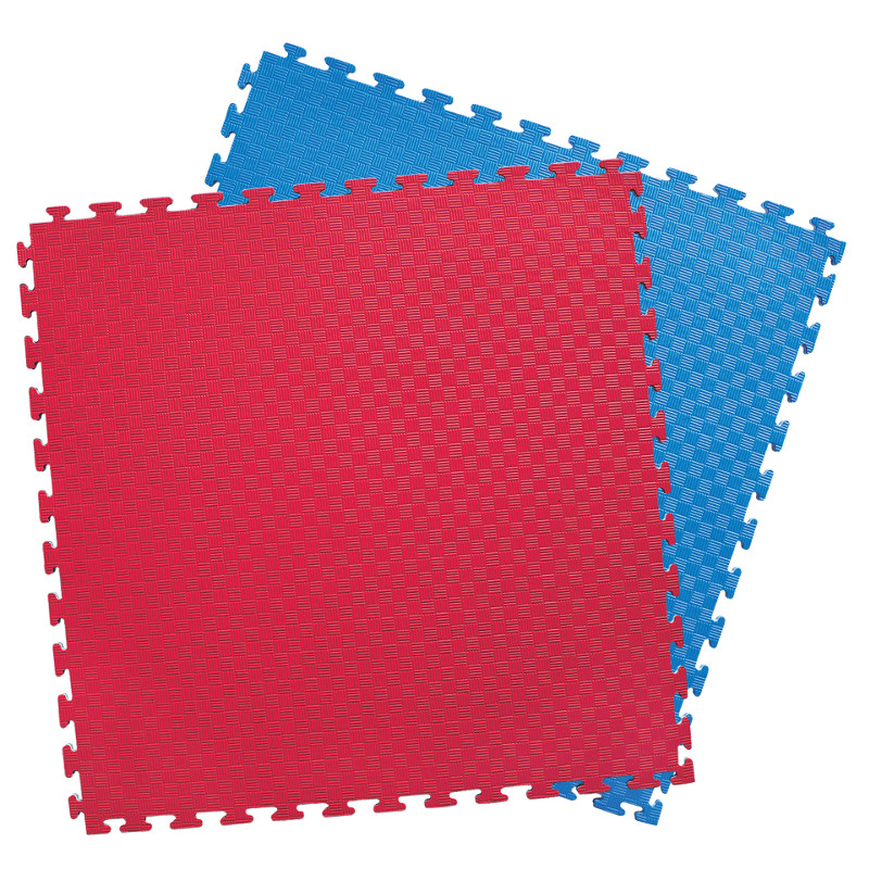 Tvåfärgade vändbara tatamimattor.Mattorna finns i röd/blå och svart/gul.