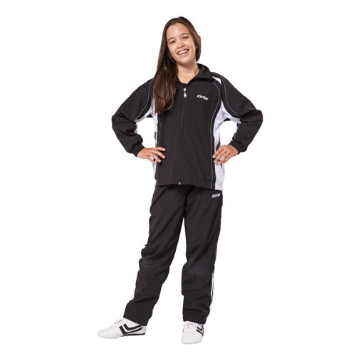 Praktisk träningsdräkt i ventilerande mikrofiber och med meshfoder. Jackan har elastiska muddar vid ärmarna. Byxan har dragkedja nedtill.