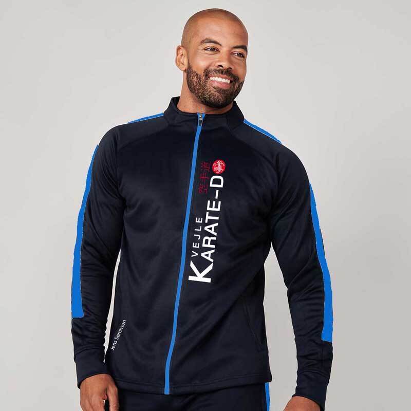 Trænings jakke i dyb blå med lysere blå kontrast.