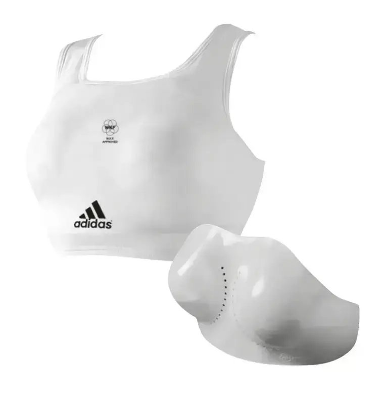 Adidas brystbeskytter WKF Official til kvinder bestående af en anatomisk hård plastikskal og en hvid bomulds tanktop.